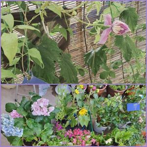 おはようございます。 先月8日に沢山の処分のお花をホームセンターで頂いてた中のクレマチスが今朝何だか弱々しい?けど咲いてくれてました。 1ヶ月経っての嬉しい出逢いにありがとうです。 蕾もついてますが蔓をカットすると元気でるかなあー 詳しい花友さん教えてください。 下は1ヶ月前のです。烏瓜達と仲良く育っています。 薔薇もとても元気に咲き始めました💐💐 皆さんいつもありがとうございます。