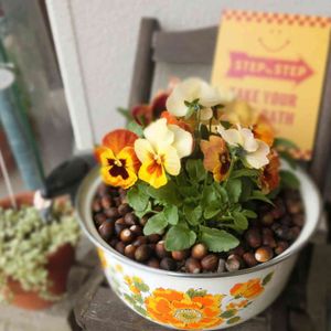 先月フリマで買ったレトロなお鍋にパンジー植えました💛 ドングリをマルチにしてみたよ😋