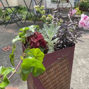 一斗缶にペンキを塗って チョコレートのぺーバーナフキンを デコパージュしました🍫😋 姉からのアイディアです。 ⬅️オレガノ ➡️キンギョソウブロンズドラゴン ⬇️ゼラニウムや葉っぱ類 渋色で寄せ植えしました😃 ゼラニウムの濃い紫が咲いたら 少し華やかになるかな(o´艸`) 楽しみです・*:..。o○☼*゚
