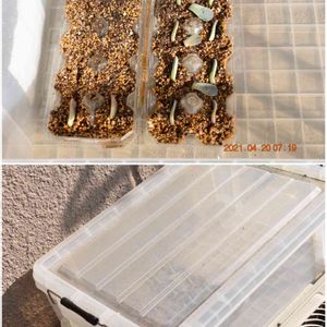 2021.04.20 葉挿しの方法などをYouTubeでいくつか見て、この方法を試してみる。 透明ケースの中で温度と湿度を上げる。