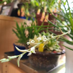 花茎がとても長いので、花が鉢に重なるように撮りました。 ぼんやりした花茎を辿ると鉢につながっています😊
