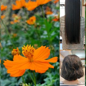こんばんは~😆 7月もどうぞ宜しくお願いいたします😉🎵 ~キバナコスモス~です💠 鮮やかな彩りで咲いています💛 早いなと思いましたが、 開花期は6~10月と長いようです。 コスモスより葉の切れ込みが、 深いのがキバナコスモスの特徴です。 黄色やオレンジ、赤色が美しい✨ ~番外編~ 今日、ヘアドネーションしました✂️ 前回 2022年9月に体験して2度目です。 本当はキリの良い時に✂️たかったけど、 私は人一倍汗かきで、髪が広がり易いので、 パーマをかけてみたらというアドバイスで、 今回イメチェンしてみました🎵