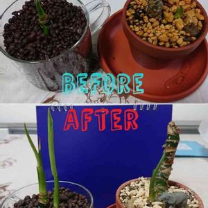 昨日【名前を教えて!】投稿で教えていただいたアグラオネマを大急ぎで植え替えました💦 お水大好き、直射日光は苦手…とのことで、枯れてしまった当時の環境が… ・職場に置かれていた ・ハイドロボール?なのに穴あきプラスチック鉢植えで誰も水をあげていない ・エアコン直撃 ・直射日光 根っこが切り干し大根みたいになっていました… 辛うじて2mmくらいの根っこがある方を土植えに 根っこ0をハイドロボールに植えています… 復活してくれるのでしょうか… いい案があったら教えてもらえると嬉しいです😃✨ 復活までがんばります!💪