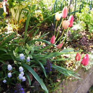 今日のお花 玄関横にあるボーダーガーデンに💙ムスカリと蕾のチューリップ🌸