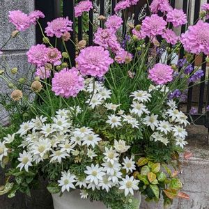 2年目の寄せ植えが咲きそろってきました😆 スカビオサとラベンダーが 風でユラユラ揺れて可愛いです