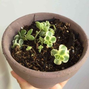 以前アップした「斑入り丸葉万年草」の寄せ植えポット。購入後ポットのままですが、プリプリモリモリに成長しております♫ 茎元にも新芽をみっけ〜💕。可愛すぎるんですけど〜🌟 早く植え込みたいけど何に植えるか決まってません汗💦でも増やしたいからゆったりでいきますp(^_^)q。
