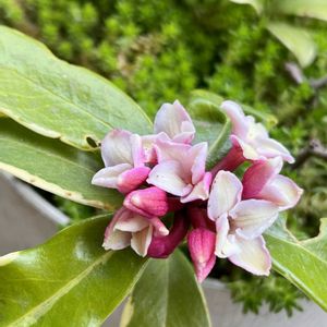 チビちゃん沈丁花 咲ました 斑入りの葉もかわいい😆🙌 背丈はまだ10㌢ほど~ 去年切り花いただいて 挿して 根付いて 花がつくとは😆うれしい♡…