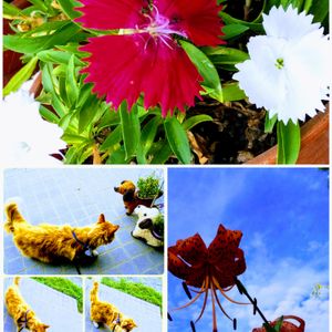 おはようございます(*^_^*) ナデシコ紅白咲きました💕 久々の青空とオニユリ⚜️ ワンコの置物にビビってる 🐈🐾くぅですニャンฅ(>ω< )ฅニャン
