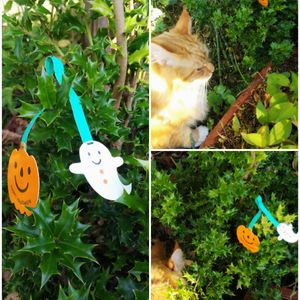 おはようございます☀ 今日のお花🌿「ヒイラギ」 花も実も付かないので 😸くぅと、🎃ハロウィン🏷おまけ😀