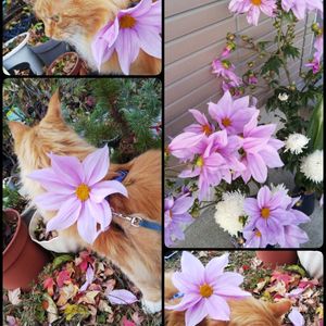 おはようございます😸 皇帝ダリア💜風🍃と霜🥶で見納めになるので花遊びฅ(^^ฅ) 直径15cm大きい!!花の香りはあまりしないです(ฅ•.•ฅ)🌸