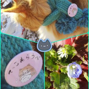 おはようございます🐱 ニャンニャン祭りฅ(^^ฅ)ニャン♪ 🐈🐾くぅお気に入りの🧣マフラーと🎁プレゼントの缶バッジ🎶 丸森町の方言「てっこあらうべ」→手を洗いましょ、洗おうか 丸森町には、猫神様が祀られ色々なネコグッズがあります😺 ハコベ、オオイヌノフグリ咲いてました❀.*・゚