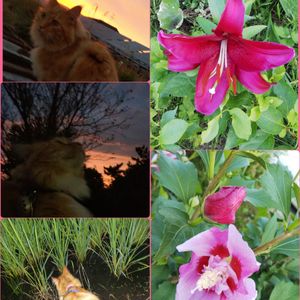 おはようございます☁*° 昨日の🌇夕散歩🐈 台風8号接近中なのに夕焼け?! 雨降ったりやんだりです💦 カサブランカマンボ、ムクゲ咲いてます💕