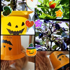 おはようございます🔆🔅 観賞用唐辛子🌶 💜パールフラッシュ斑入り葉(見えにくい💦) 右上5色唐辛子だけど、オレンジの🧡1粒だけ😅 🐈くぅに🎃鉢カバー被せようとしたけどヾノ ◜ω◝ )イヤイヤされました~😹