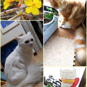 ニャンニャン祭り2枚目🐱 今日は☁寒いし眠いニャン 💛キングサリ💜シラー(オオツルボ)咲きました*°♡