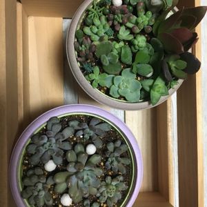 寄せ植えの多肉さん達、湿気に負けず育っています。ちょっぴり徒長気味だけど💦 我が家のバルコニーや玄関先では日光が足りなさそう😓 置き場所を変えたりして何とか対策しています。 頑張って大きくぷっくり育ってくれ~💪✨