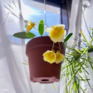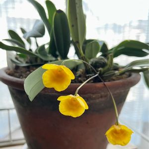 シケてシケてたった3輪しか咲かなかったデンドロビウム ウェンツェン。 垂れ下がった黄色いパンジーみたいです😆