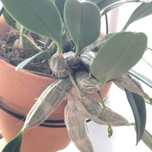 世界らん展2023を見に行った記念に、花なし株をひとつお土産として購入。 花は来年かな?と思っていたらポツンとバルブの横から花芽らしきものが伸びてきて、2つですがレモンイエローの小さく可愛いお花が開花しました!