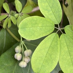 アケビ(木通、通草) アケビの実はまだ食べたことがありません。 よく似たムベ(郁子)の実は2023年にいばらきフラワーパークの前の店で買って、食したのですが😆でした。 1️⃣五葉アケビ まだ蕾 蕎麦屋さん アケビとミツバアケビの自然交雑種 柔らかい5枚の葉が手のひらのよう。花は白、薄桃色 2025.3.31 2️⃣雌花 2021.4.6 雄花より大きく、濃い紫色 中心部は放射状 3️⃣城山の帰り ⬅️雄花 2023.4.19 中心部は球状 花色は薄紫色 ➡️雌花 4️⃣アケビの実 2024.10.17 散歩 林縁 5️⃣アケビの実 2021.9.30 大きく縦に割れています。 ※ムベの実は割れません。