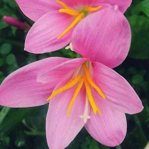 この花は…… 非常に美しいです 👀 名前は母がヒントをくれました。 『サフランなんやない?』 サフラン……⁉️ 何か違うと思いつつ…検索 やはり別の花やんと思った矢先… あっさり同じ花が登場⁉️ なるほど… 『サフランモドキ』なんですね‼️ 実に覚えやすい花……です(笑) 別名:ゼフィランサス カリナタ ヒガンバナ科 その花姿は冗談抜きで美しいです😀