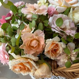 ①②今日咲いてくれたバラたちを、ワイヤープランツとバスケットに盛っただけ😅 ③ラマリエも花弁少なめの夏顔です。 ④コンブレナラブラブラブは、風に揺れて可愛いです。 ⑤バフビューティ 去年、鉄砲虫に大きな穴を開けられて弱ってますが😂時々咲いてくれます。