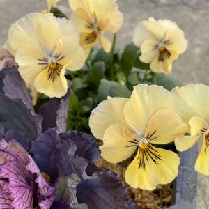絶妙な色合いのビオラ"ロカハーツ"に出会いました 育種家川越ロカ氏より譲り受けたビオラを、八ヶ岳のフラワーハーツさんが育種したものとありました 良いものは受け継がれていくべきですね ビオラメインのはずが、サブの葉牡丹が目立って目がいきがちになりますが…💦