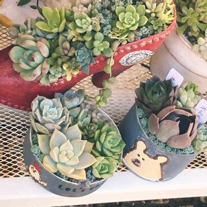 たかこさんに頂いた多肉ちゃんを使って寄植えをしようシリーズ🍀 ニワトリのリメ缶に使ったのは名前が付いてなかったけど可愛子ちゃん達(o´ω`) 手前の白っぽいちょっと大きなサイズの子はKEIKOさんから頂いて増やしてる姫おぼろ月ちゃん🍀 試作品のクマのリメ缶に入ってるのは大和美尻ちゃんとベンバディスちゃんと多分マロームちゃんかな?(*´艸`) 息子がお休みで家にいるのでスマホ取られがちで急かされるので写真が雑でゴメンナサイ(´;ω;`)