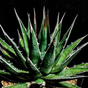 アガベ 帝釈天 葉に並ぶ棘が鋭利なタイプ👍 先端の鋭さに集中しているのもいればチタノタの白鯨みたいな白さの棘の帝釈天もいます。 地味系だと思っていたアガベですがなかなか個性豊かですね。