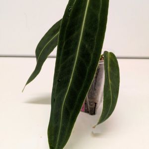 ナイトジャングル😊アンスリウム原種クラリネルビウム😊丈夫で育て易いです〜😊4姉妹👭👭 アンスリウム・クラリネルビウムは、アンスリウムという大きな属の中の**「原種(種小名: clarinervium)」**の一つです。 アンスリウムの仲間は世界に600種以上もあるとされ、大きく分けると、花(仏炎苞)を楽しむ「一般園芸種」と、葉の美しさを楽しむ「原種系アンスリウム」に分けられます。 クラリネルビウムは後者の**「葉の美しさを楽しむ原種系アンスリウム」**の代表格です。 🍃 葉を楽しむ原種系アンスリウムの主な仲間 クラリネルビウムと同じように、葉のユニークな形や葉脈の美しさが魅力の原種系アンスリウムには、以下のような種類があります。 1. ハート型の葉と白い葉脈を持つ種類 クラリネルビウムと同様に、ベルベットのような質感の濃い緑色の葉に、白やシルバーのくっきりとした葉脈が入る種類です。 • アンスリウム・クリスタリナム (A.\ crystallinum) • 葉の形はクラリネルビウムに似たハート型で、白くはっきりとした葉脈が特徴です。 • 特に葉が丸みを帯びた**「ドラヤキ」**と呼ばれる品種も人気があります。 • 和名では「シロシマウチワ」とも呼ばれます。 2. ユニークな形の葉を持つ種類 ハート型とは異なる、特徴的な形や質感を持つ種類です。 • アンスリウム・フォルゲッティ (A.\ forgetii) • 葉の形が**小ぶりな涙型(または円形に近い)**で、付け根の切れ込みがない、ユニークな形をしています。 • 濃い緑色の葉にシルバーの葉脈が入り、成長するにつれて葉脈のシルバーが濃くなるのが特徴です。 • アンスリウム・ワロクアーナム (A.\ warocqueanum) • 細長い縦長の葉を持つ、非常にエレガントな種類です。 • 葉脈はあまり目立ちませんが、葉の表面全体がベルベットのような質感と光沢を持ちます。 • アンスリウム・ビレナオルム (A.\ veitchii) • 非常に大きく縦長の葉を持ち、成熟すると30cm以上になる大型種です。 • 葉の表面には光沢があり、波打つような凹凸(アコーディオンのような見た目)が特徴的です。 3. その他 • アンスリウム・フーケリー (A.\ hookeri):団扇のような丸い葉をロゼット状に広げるタイプで、バリエガータ(斑入り)種も人気です。 クラリネルビウムは、これらの葉を楽しむ原種の中でも、比較的小型で育てやすく、葉脈のコントラストが非常に美しいことから人気が高く、**「ベルベットアンスリウム」**の代表的な種として愛されています。