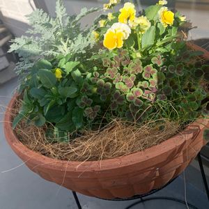 ベランダに持って来た寄せ植えです。寝室から見えるので毎朝、様子が見えます😌ももかの黄色も、すごく可愛いです😆🧡 後で思いましたがクローバーは分ければ良かった😅塊で植えちゃいました。何事も経験なので次に活かしたいです。 今日は晴れですが、かなり強風🍃🌀落ち葉を沢山拾ってゴミに出しました。 ビニール詰めの再生土(木酢液入り)と、底石を日に干してます☀️殺菌殺菌〜👍