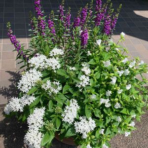 おはようございます。8/3にも投稿したばかりですが、ペンタスの大鉢での寄せ植えです。今が過去一でモリモリです。 イソトマは、もう陣取り合戦(暑さ?)に負けて影を潜めてます🙄 映っていませんが、アンゲロニアの下葉が黄色くて、原因が蒸れか肥料切れか判らず💦 ↑とりあえず週末にリキダスと液肥をミックスした水をあげておきました👍