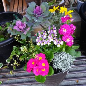 こんばんは🤗🌟 2年目のカランコエが 少し咲いてます 去年から咲いてる プリムラジュリアン🩷 2年目の葉牡丹🌸💚 アルメリアとスイトピーの 寄せ植え スイトピーまだまだ 小さい葉っぱ🌱だけです 咲いてくれたら嬉しい (✿^‧̫^✿)ですね 今日もお疲れさまです (꜆*ˊᵕˋ)꜆🍵