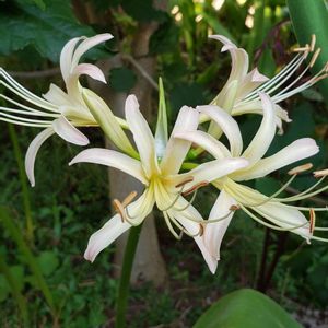 リコリス「秋月」です。オニユリの葉っぱと交錯してしまいました😆。
