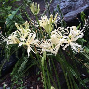 【シロバナマンジュシャゲ】 白花曼珠沙華 ヒガンバナ科 ヒガンバナ属 台風前の雨に打たれ何となく悲しげな白花曼珠沙華 👀 黄色のショウキズイセン(鍾馗水仙)と赤花の彼岸花の自然交配種らしいですが種間交配でその品種は多いようです。 中央にピンクが出るものや写真のように黄色味を帯びるものなど微妙な色合いの違いが楽しめるようです。園芸的には赤花も含めリコリスで球根が出回ってます。 花と葉が同時に出ない為、色々な解説で使われてる『葉は花を思い花は葉を思う』この言い回しが好きです😀