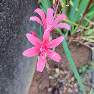 確か去年球根を植えたハズなのに咲かないと思ってたら、前の所と違う所に植えたみたい😂 忘れてた😂 リコリス スプレンゲリー💗 今年はかなり濃いピンクです~💓 後ろにはリコリス……なんだったろう⁉️ 白も咲いてます~🎵