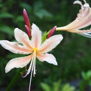 "四季の小径" 夏〜秋 <リコリス(オリジナル交配)> 蕾は薄紅色!開くと‼︎ 淡いピンクを帯びたクリーム♪柔らかな色合いが可愛いリコリス☆彡 ヒガンバナの仲間のリコリス♪ 今の時期だけの季節花^ ^ リボンのような細い花弁がくるっと巻いて可愛らしい♪