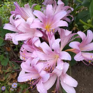 おはようございます✨ 今日は、曇☁から雨☔です。😅 リコリスが咲き揃いました。☺️ ピンクに少しですが、紫が 入ってます。🤩 今日も一日 頑張っていきましょう💪😉🥭