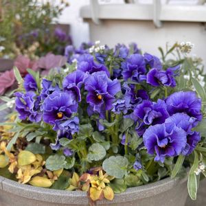 アクアレール植え付けました✨✨ キレイなブルーグレーを活かしたくて プラチーナのみで。 今はちょっと貧相な感じですけど💦 お花が増えてきたらバランス取れるかなと思います😊 2枚目:先日のアナ雪イメージ寄せ植えと、ブルーのプティシャトンというパンジーと、並べて眺めています🤭💙🩵💙