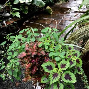 ゆっくり進む超大型台風、東京の西も断続的に激しい雨そして晴れ間を繰り返している。 庭はびしょ濡れ💦で庭パトも出来ず… 先日、値下げされてたので買った寄植え、赤いコリウスとユーホルビア、ミスカンサスが入っていて、何かが枯れて一株分のスペースが空いていた。鉢を入れても300円じゃ、お買得かな?グリーンのコリウスを追加した。やっと皆んな生え揃って来た✨