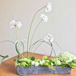 今回のフラワーアレンジメントは、 「構造的+線」というものでした☘️ 構造的、風な感じをベースに、線の花材を入れたオリジナルなデザインです。線の花材は、リューココリーネとミスカンサスでした。ちょっと難しくておしゃべりしてる余裕もなかったです😅