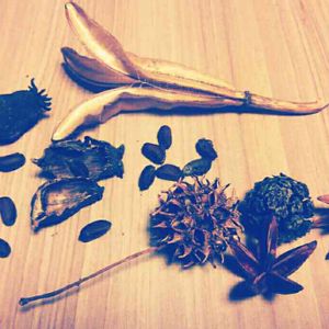 昨日1日のお土産。 ヤマユリ?と蝋梅の実、夏椿の種が出た後の星形の殻、モミジバフウの実と松ぼっくり