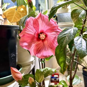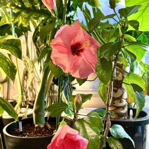 今日のハイビスカス🌺ロングライフシリーズアドニスピンク3輪😊インドアハイビスカスサニーシティ赤1輪😊常夏🏝️🌺🌺🌺
