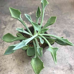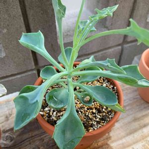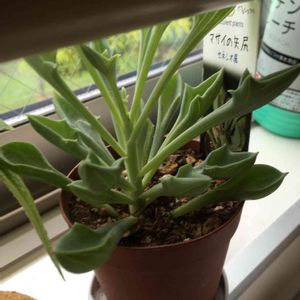 マサイの矢尻。 室内療養中。 寒さに強いと小耳に挟んでいたような気がしたが、我が家のはまだまだ弱かったらしく、葉が傷んで枯れたりしたので、葉をほとんどバッサリカット。 ダイソー産で我が家に来るまで冬は店舗内でぬくぬくしていたから初の外での冬越しはキツかったのかもしれない。 我が家に来たのは去年のいつだったかな、3月辺りかな。 そういえば、カットした時に独特の匂いがした。 その匂いに刺激されたのか、新しい葉が咲き終えた花芽の脇から、あとライナーで子株らしきものが出てきた。 雑草は毟ると土の中の根が刺激されて新しい葉を生やすホルモン的なものを出すとかこれまた何かの文献で読んだようないないような。 雑草魂。たくましいですもんね。 マサイの矢尻もその機能だったら面白いと勝手に想像。 多肉たちも現地では動物や昆虫に食べられるから何かしらの生存本能があるはずだけど、現地とこの我が家では数が違うからなぁ。現地は100体中1、2体生き残れば良いけど、我が家は1体を必ず生き残らせないといけないから予備数が比べ物にならない( ;∀;) このマサイの矢尻は今の管理のままなら復活するから心配していない。 根がしっかりしていそうだし、春になったら土を新鮮なものにしたいし、鉢替えだな。
