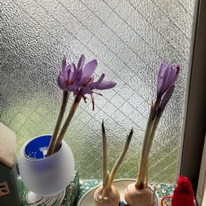 今年初めてサフラン転がし栽培?しました! 今日ちょうど咲きました💜💜 まだ咲いてないのがキッチンにもあります💜 身近な方々にも球根のお裾分けをして ツボミ!咲いた! など喜んでもらってます