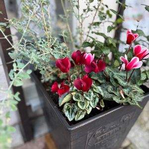 先日作った寄せ植えの1つです これは前の冬の寄せ植えのグリーンを少しカットしてそのまま使ってガーデンシクラメンのみ新しく入れ変えてみました🪴