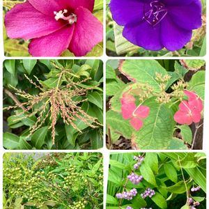 こんにちは😊 食事処「梅の花」で美味しく頂いて いつもの「さかい利晶の杜」での花木との出会いです❤️💜🤍🍀 ① コラージュにしました😄 ② ムクゲ 可愛い〰️色合い ③ シコンノボタン ④ ヤマアジサイ ⑤ ムラサキシキブ 5枚あります🌿 見てくださいね😊🎶💕︎
