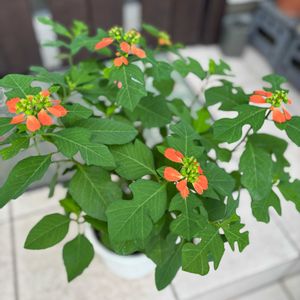 ①姉からのプレゼント! 種から育てたらしい🧡💚 サマーポインセチア(猩々草) このグリーンの中のオレンジが少し がなんとも言えないステキ🧡💚 ②今玄関 奥に見えるのはよく咲くミニ薔薇と水色のルリマツリ🩵 手前は最近寄せ植えにした鑑賞用唐辛子とマリーゴールド🧡