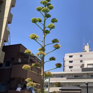 こんばんは😊 今日は35℃近くて暑かった🥵 今日のお花 💠 アガベ 💠 最近 月一で堺市に行く道すがら アオノリュウゼツランの開花を見る 100年に一度の開花で花が終わると枯れるリュウゼツラン😆 2018年には花博記念公園鶴見緑地の咲くやこの花館で見ました。 枯れる姿も展示してあった🎄 過去picですが見てくださいね😊🎶💕︎