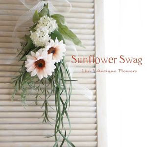 毎日暑いですね🥵 我が家のリビングにひまわりのスワッグ🌻🌿アーティフィシャルフラワーのひまわりは黄色ではなくアイボリーを選びました! グリーンとスノーボールもお気に入りの組み合わせです🌿 1枚目2枚目の写真はレッスン先で撮って頂いたものです