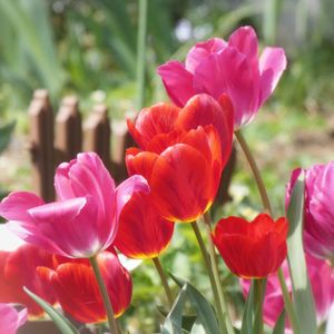 「今朝のチューリップ🌷たち」 庭に出てみると 少し寒いくらいですがチューリップ🌷たちは、朝日を浴びて 元気いっぱいでした。