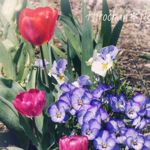 「パンジーたちとチューリップ🌷」 あれれ⁉️ いつの間に チューリップ🌷が出て来たの… 仲良く、いい雰囲気❤️ 今年は 例年より庭の植物たちの成長が 早い💦💦